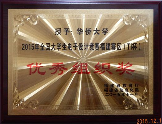 我校首获全国大学生电子设计竞赛福建赛区优秀组织奖 12月12日,2015年全国大学生电子设计竞赛福建赛区TI杯颁奖大会在福州大学举行。